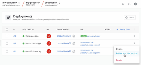 Upon deploying changes, Edgecast assigns a unique version number to the deployment. This allows you to track the changes deployed to this environment.