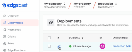 Upon deploying a build, view deployment information from within the Edgecast Console by navigating to the desired environment, clicking on Deployments, and then clicking the deployment’s version number.