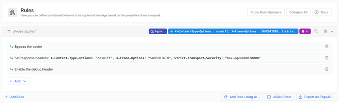 Create a rule without match conditions to apply a set of features to all requests. The recommended position for this rule is the top of the list. This allows rules positioned below it to override this configuration for specific use cases.